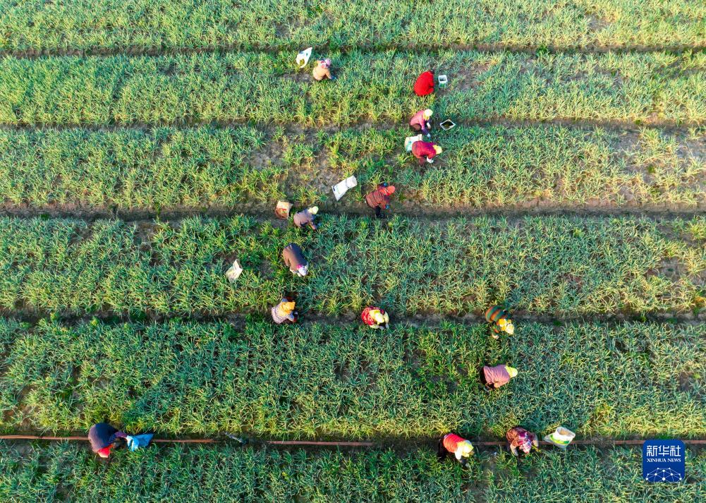 11月22日,农民在江苏省兴化市兴东镇东鲍村香葱种植基地给香葱除草(无人机照片)。