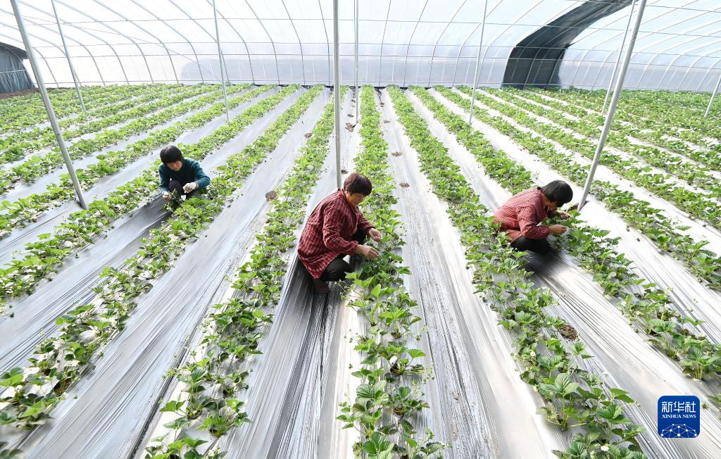 11月22日,河北省邯郸市磁县讲武城镇北白道村的村民在大棚内管护草莓。