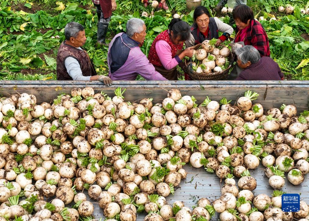 11月22日,四川省南充市蓬安县平头乡三元贯村村民在采收白萝卜(无人机照片)。