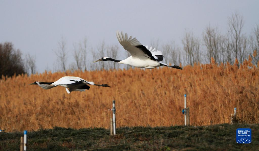 11月22日,两只丹顶鹤在甘肃张掖国家湿地公园鹤园飞舞。