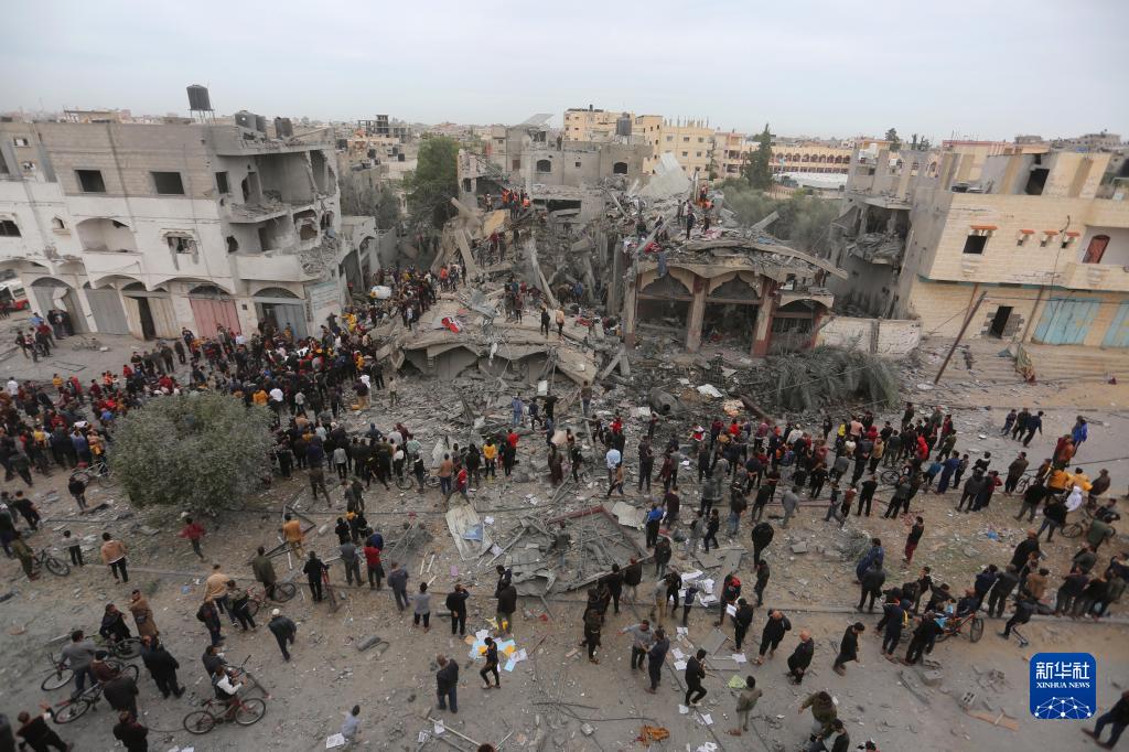 11月22日,人们在加沙地带南部城市拉法的建筑废墟上实施救援。