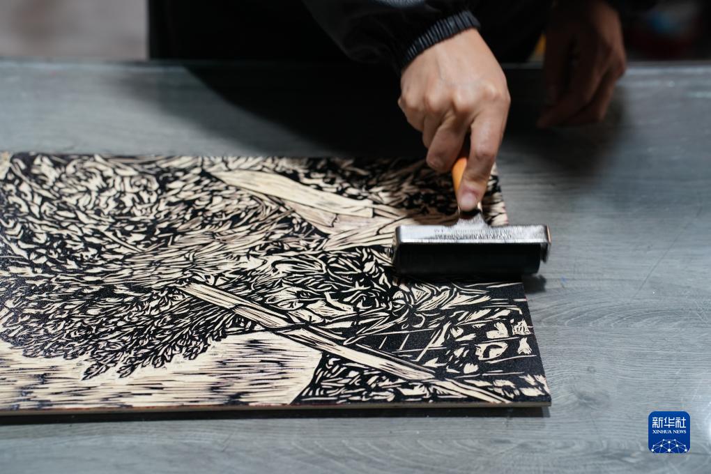 11月22日,农民版画合作社社员在旬阳市版画院内给刻版打油墨。