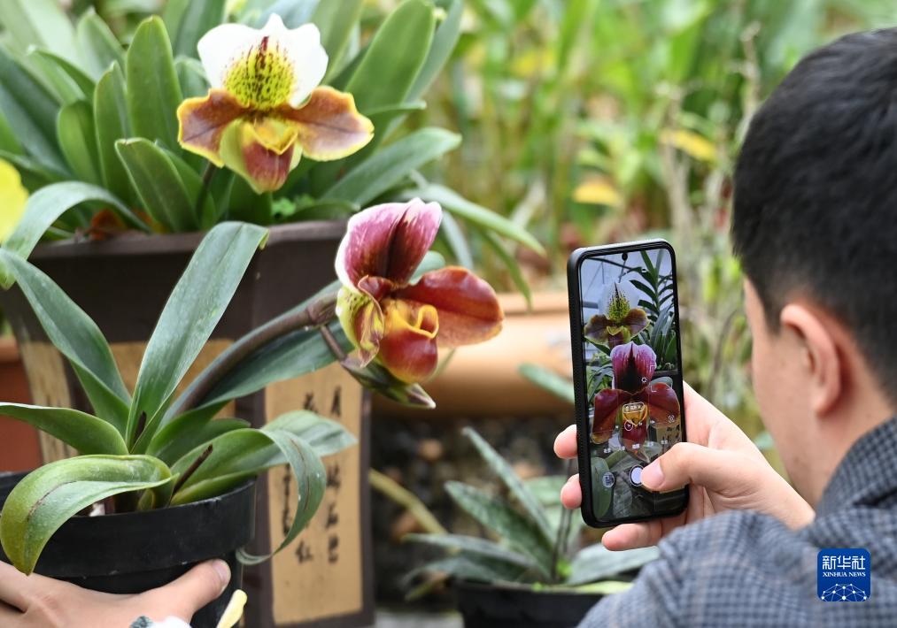 11月22日,在广西雅长兰科植物国家级自然保护区,游客在拍摄一株盛开的兰花。