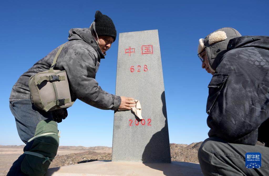 在内蒙古阿拉善左旗乌力吉苏木温都尔毛道嘎查,牧民朝勒门格尔勒(左)和儿子温都苏擦拭界碑(11月17日摄)。