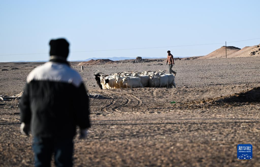 在内蒙古阿拉善左旗乌力吉苏木温都尔毛道嘎查,牧民朝勒门格尔勒(左)看着儿子温都苏赶羊(11月17日摄)。
