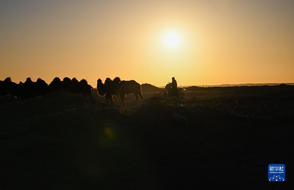 在内蒙古阿拉善左旗乌力吉苏木温都尔毛道嘎查,牧民朝勒门格尔勒在放骆驼(11月17日摄)。