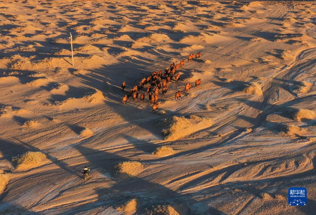 在内蒙古阿拉善左旗乌力吉苏木温都尔毛道嘎查,牧民朝勒门格尔勒(左下)骑着摩托车放骆驼(11月17日摄,无人机照片)。