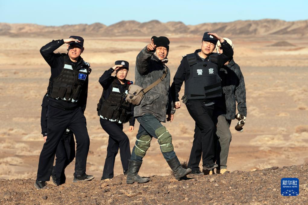 在内蒙古阿拉善左旗乌力吉苏木温都尔毛道嘎查,牧民朝勒门格尔勒(中)与阿拉善左旗边境管理大队的民警在边境地区巡护(11月17日摄)。