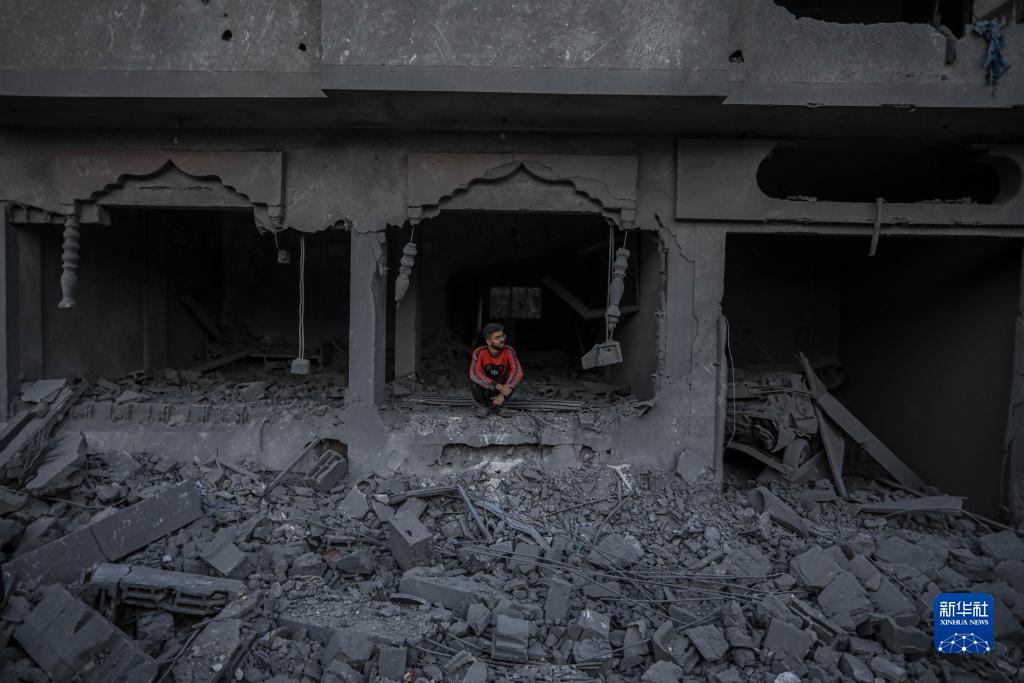 11月23日,在加沙地带中部的代尔拜拉赫,一名巴勒斯坦人查看以军空袭后的建筑废墟。