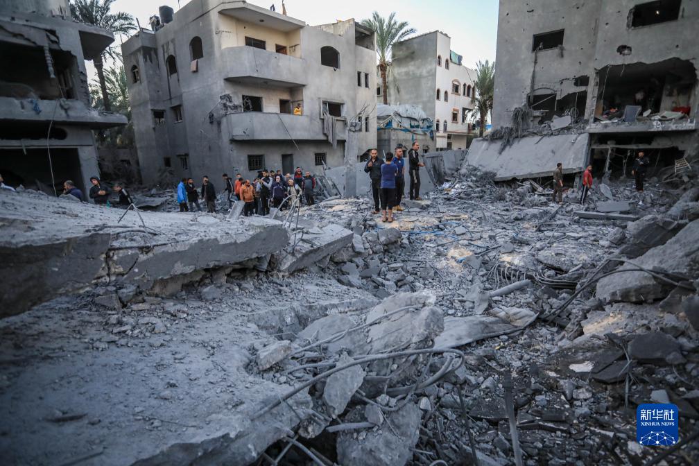 11月23日,在加沙地带中部的代尔拜拉赫,巴勒斯坦人查看以军空袭后的建筑废墟。