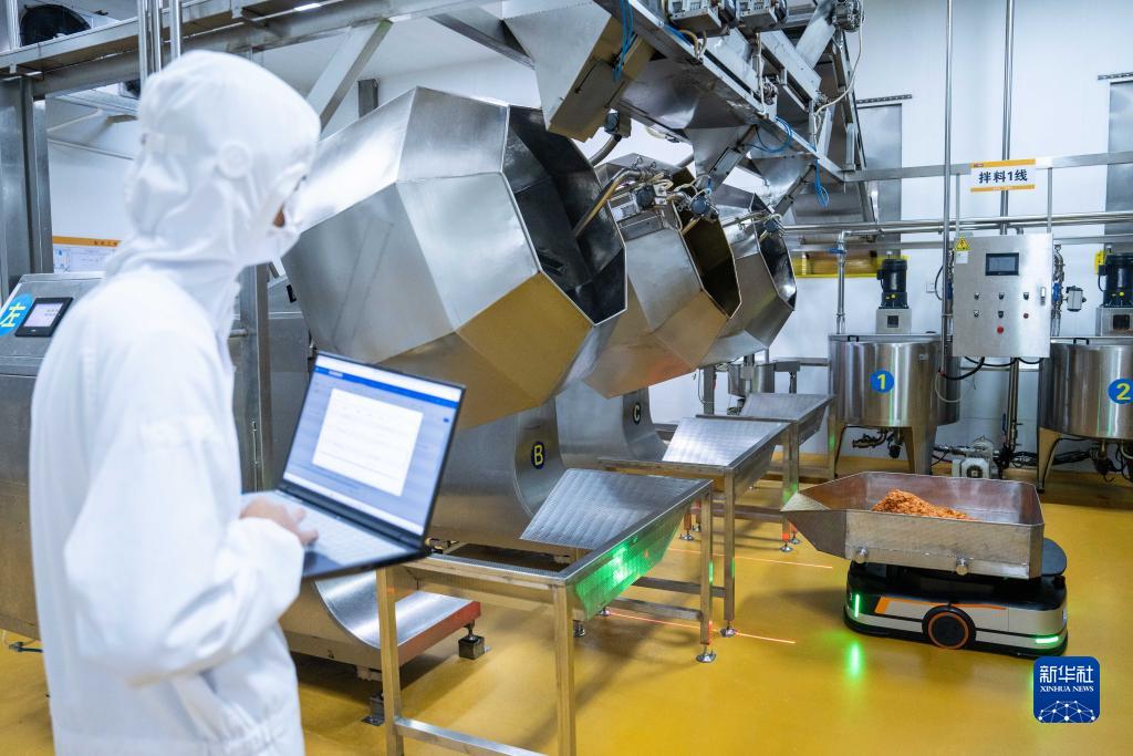 11月23日,在盐津铺子浏阳生产基地,工人操作电脑控制机器人运输半成品。