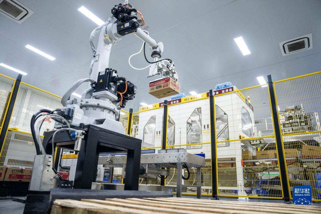 11月23日,在浏阳市大魔王魔芋食品生产车间,工业机器人在运输产品。