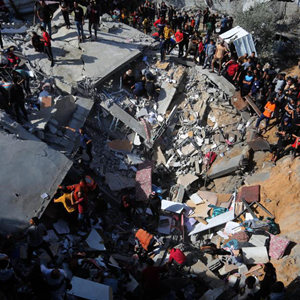 11月23日,人们聚集在加沙地带南部城市拉法一处废墟上。