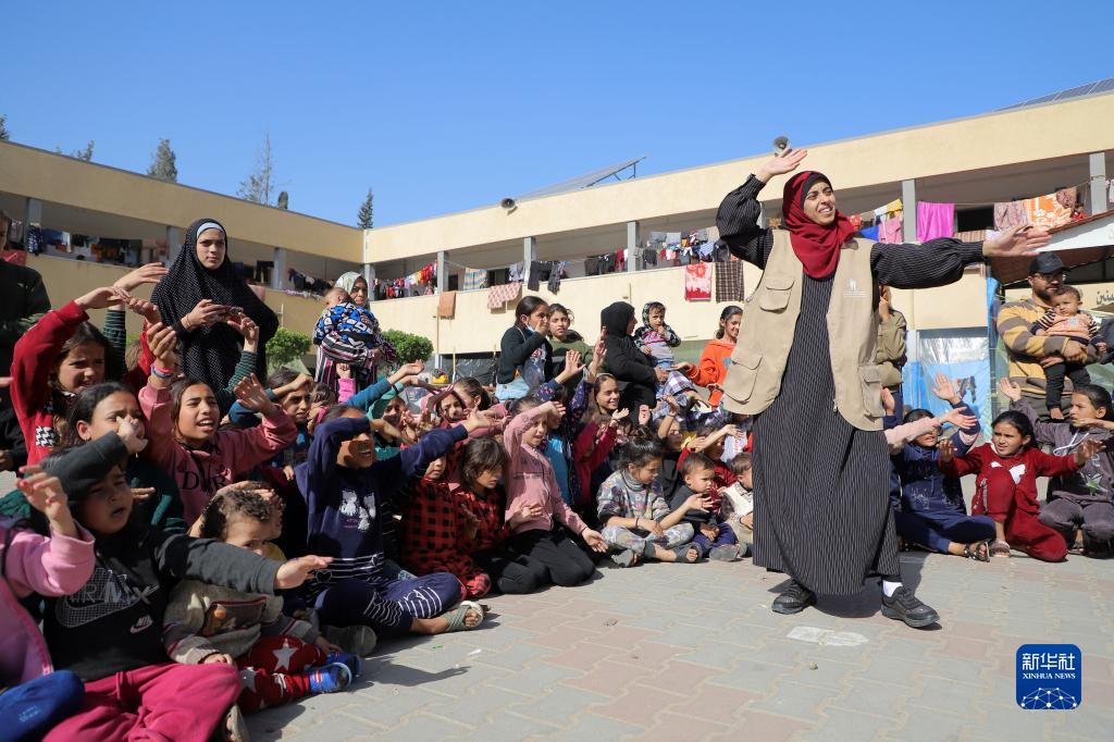 11月23日,在加沙地带南部城市汗尤尼斯,当地志愿者和儿童进行互动。