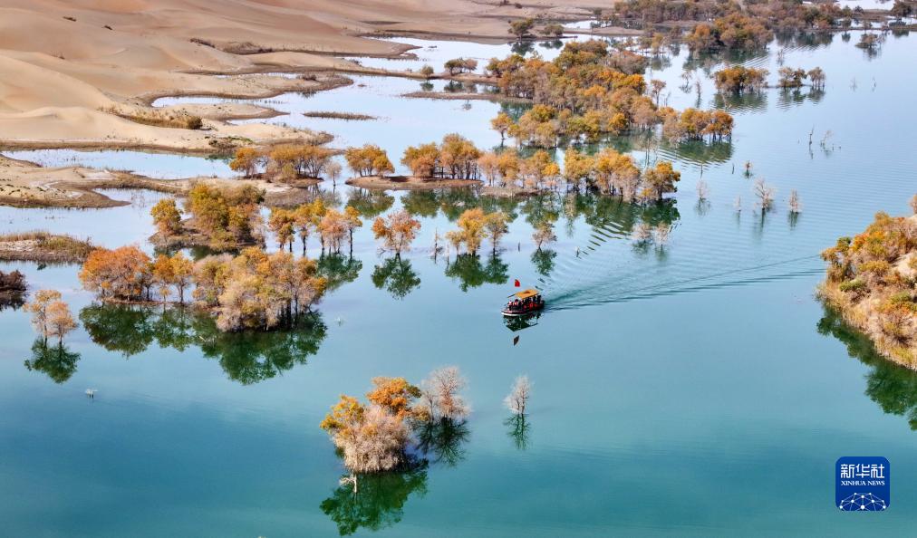 游客乘船在新疆生产建设兵团第二师三十三团的胡杨林间游览(10月20日摄,无人机照片)。