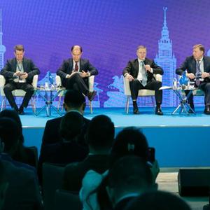 11月22日,在俄罗斯首都莫斯科,俄罗斯工业与贸易部副部长卡里莫夫(右四)参与论坛讨论。