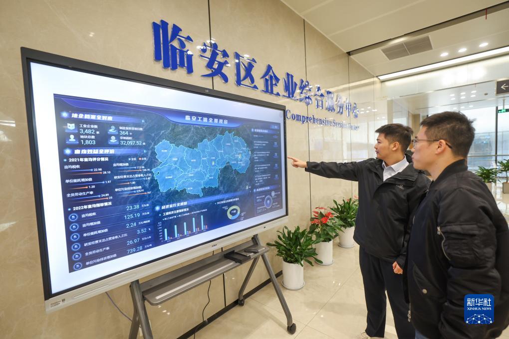 11月24日,临安区企业综合服务中心,两位企业主在电子屏幕前了解临安企业分布及发展情况。