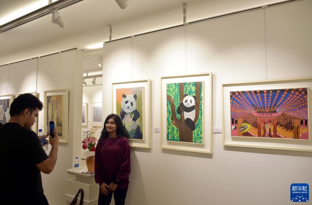 11月22日,在孟加拉国达卡,人们在“国家印象”绘画展上参观拍照。
