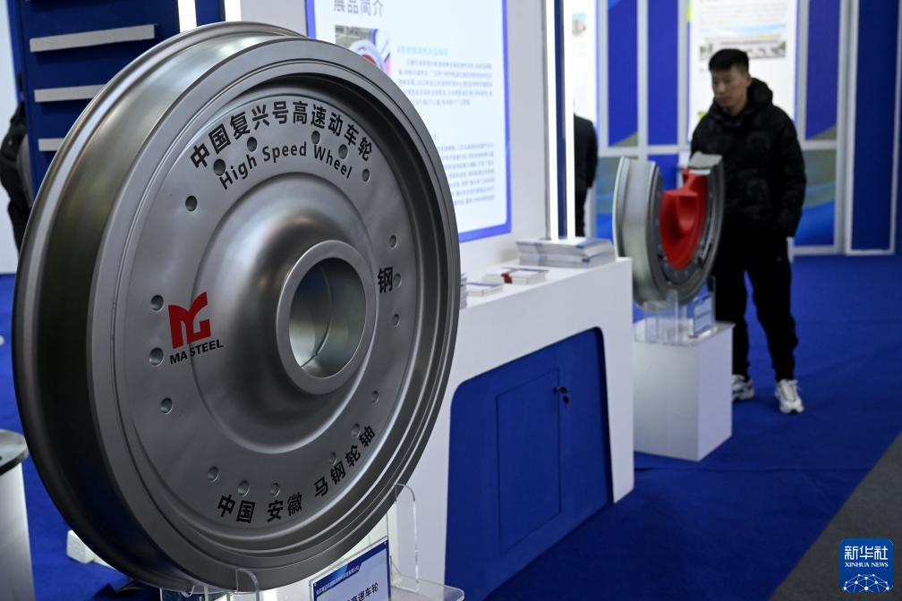 这是11月24日在第三届国际新材料产业大会展览上拍摄的中国复兴号高速动车轮模型。