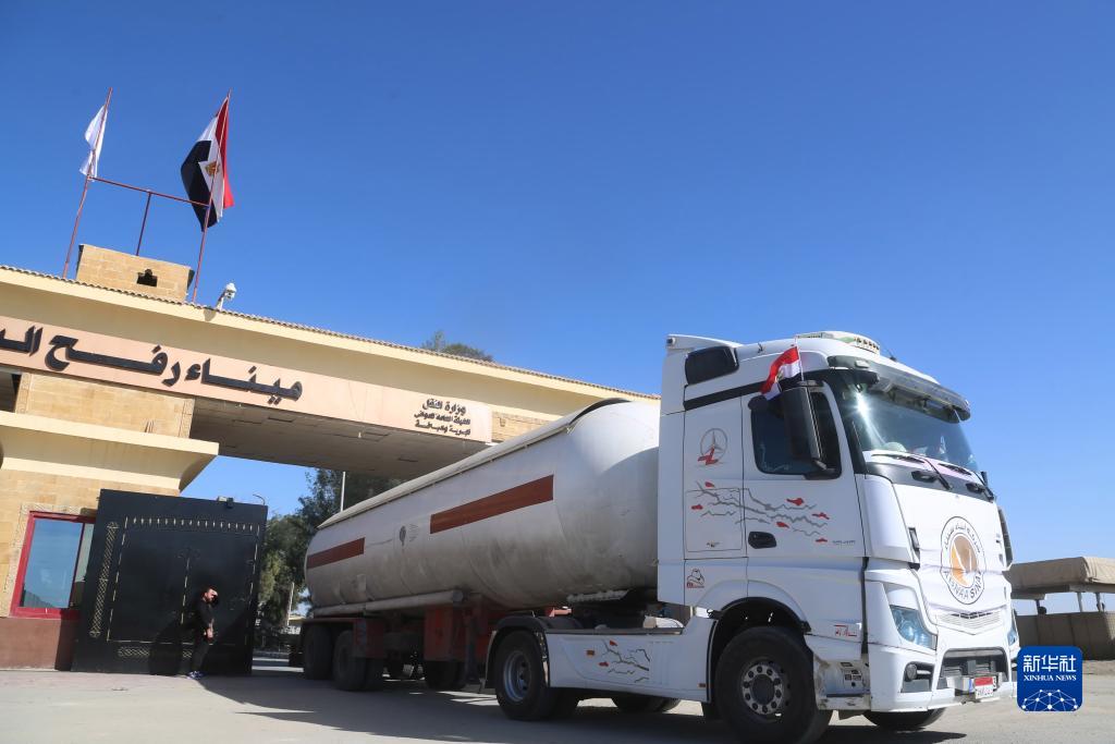 11月24日,完成运送任务的卡车从加沙返回拉法口岸埃及一侧。