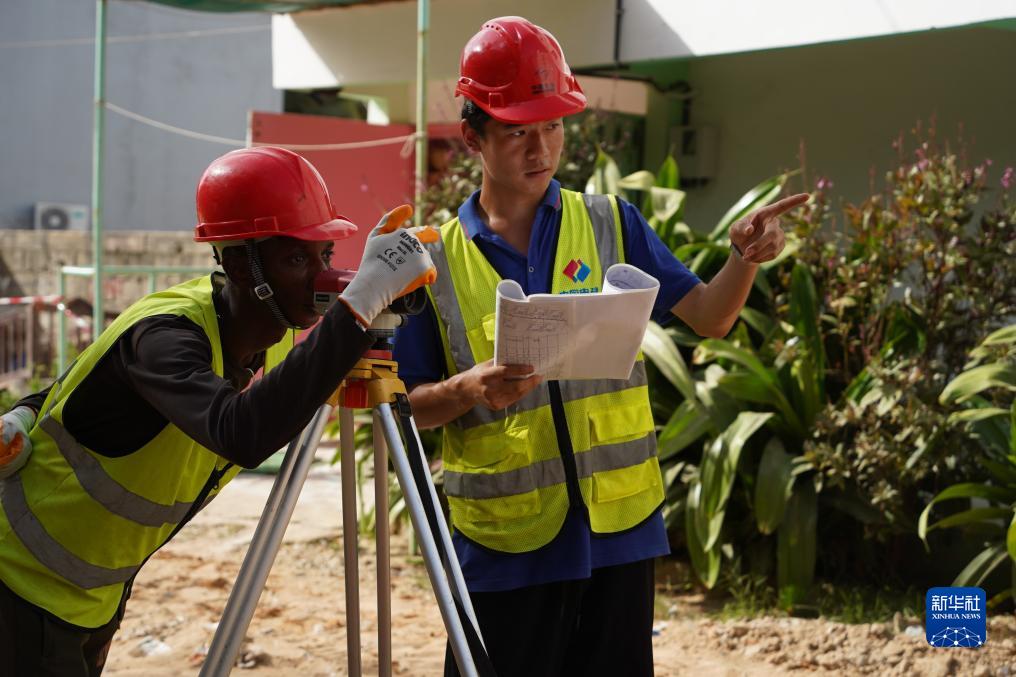 11月1日,中国工程师与当地工人在塞内加尔首都达喀尔的供水项目工地工作。