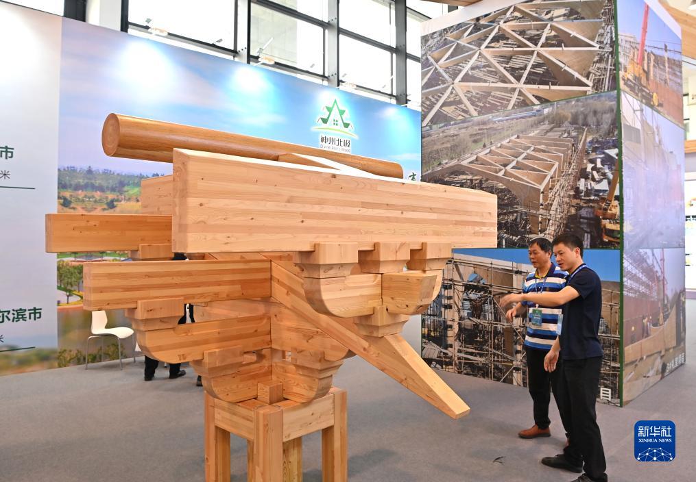 11月25日,观众在南宁国际会展中心参观榫卯结构模型。