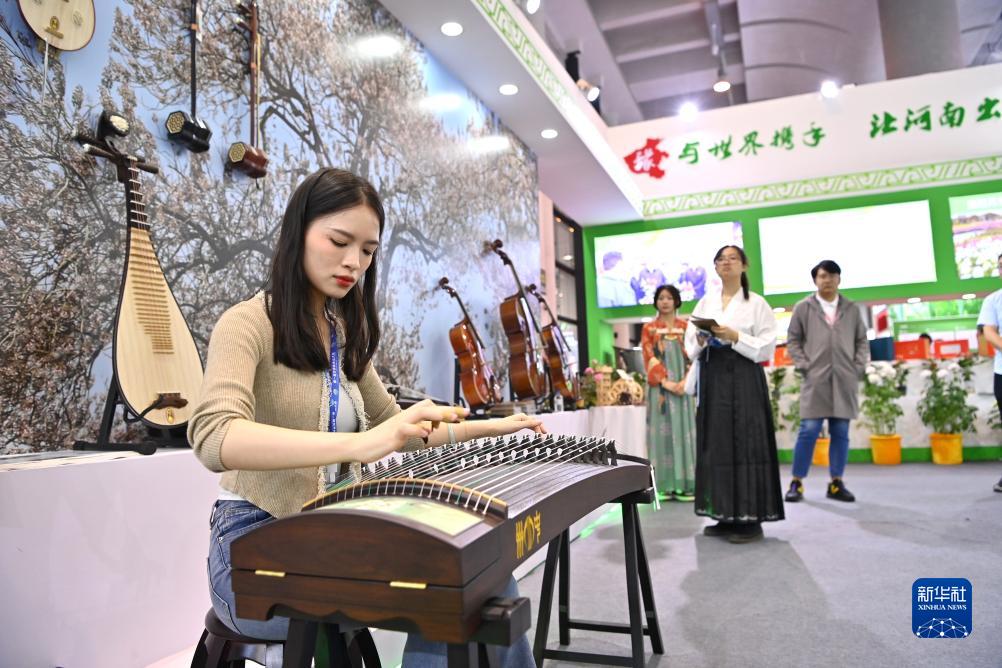 11月25日,工作人员在南宁国际会展中心弹奏古筝。
