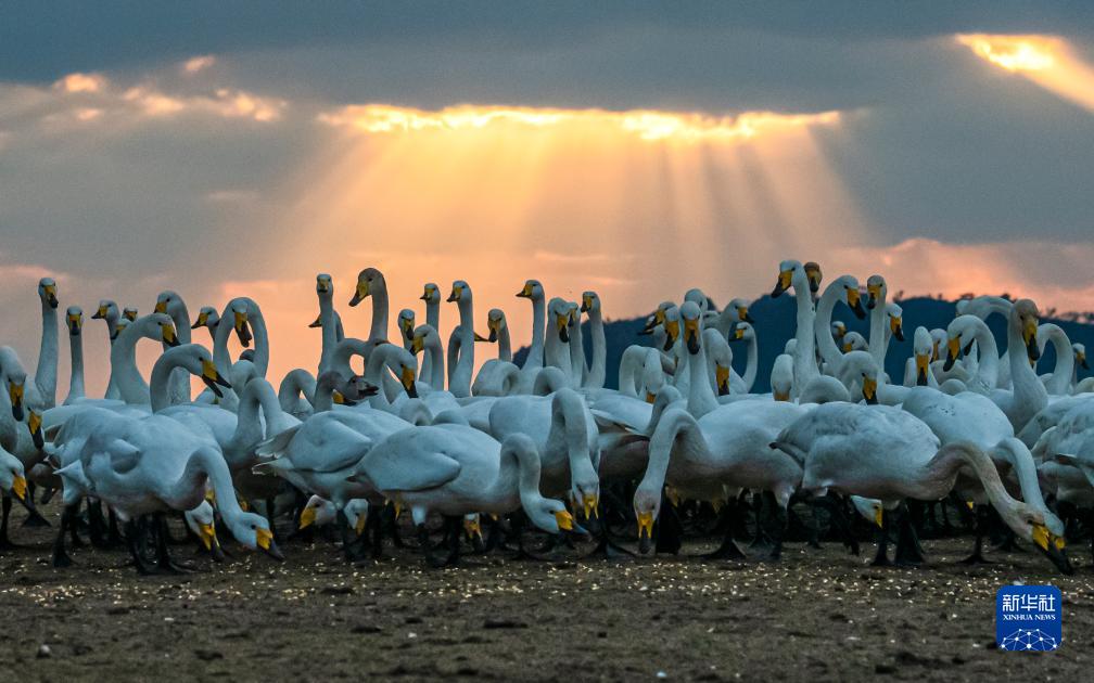 11月18日,在山东省荣成大天鹅国家级自然保护区天鹅湖湖畔,成群的大天鹅在漫步、觅食。