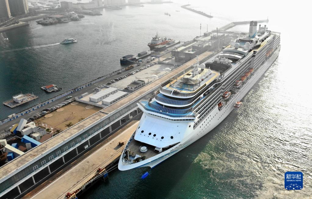 地中海号邮轮在启航青岛一济州一长崎一青岛6天5晚航次前,靠泊在青岛邮轮母港码头(11月21日摄,无人机照片)。