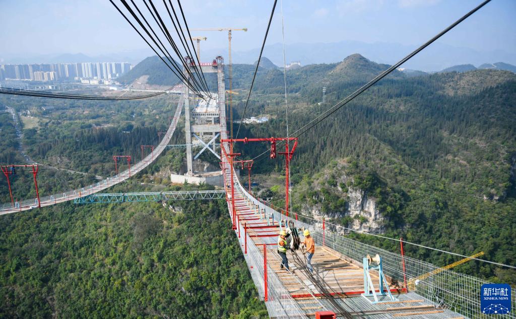 当日,由贵州公路集团承建的贵州省黔西南布依族苗族自治州兴义市金州大桥首根主缆索股顺利牵引,标志着大桥正式进入主缆架设阶段。金州大桥是贵州省跨径最大的市政悬索桥,是连接兴义市和义龙新区的重要城市通道,大桥全长1600米,设计时速60公里。