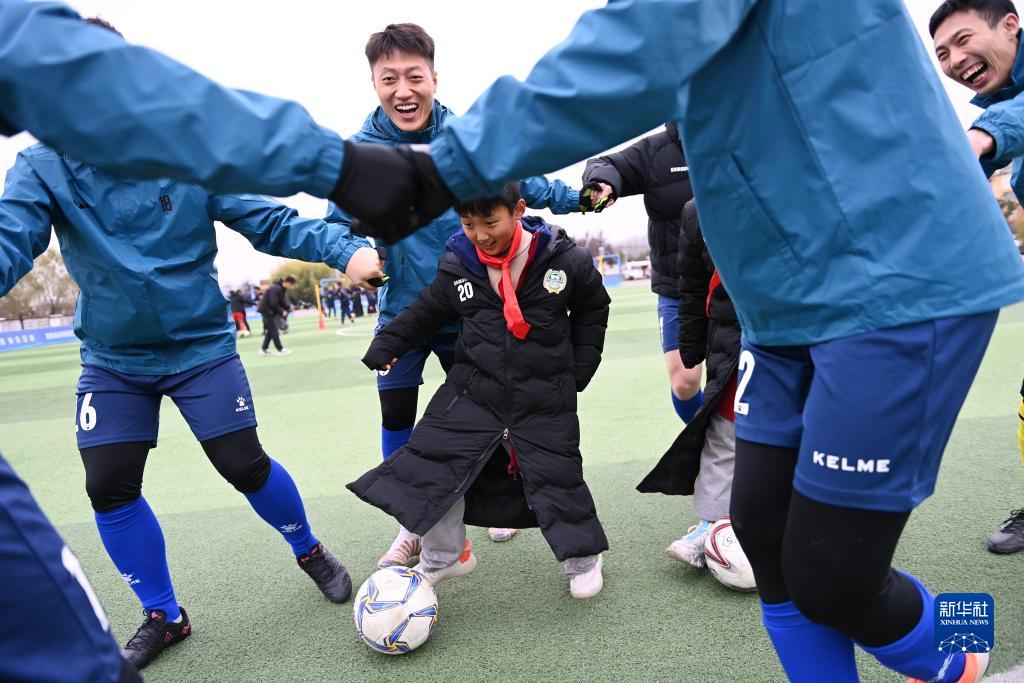 11月25日,受助学生和三星足球队球员在乡村学校公益足球课堂启动仪式上参与趣味足球活动。
