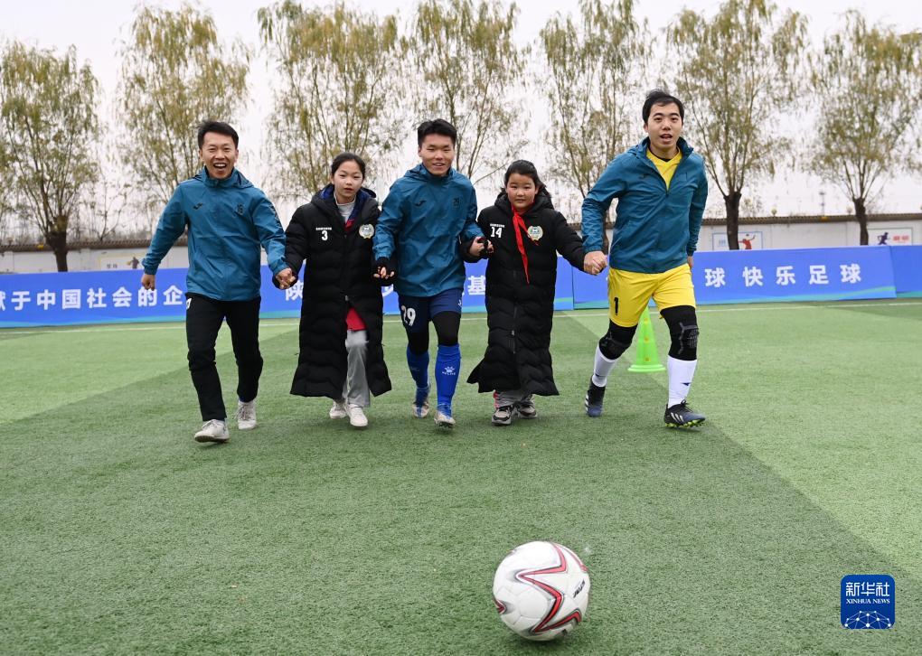 11月25日,受助学生和三星足球队球员在乡村学校公益足球课堂启动仪式上参与趣味足球活动。