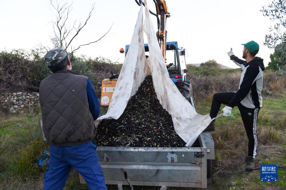 11月24日,两名男子在西班牙卡塞雷斯的农田里收获橄榄。