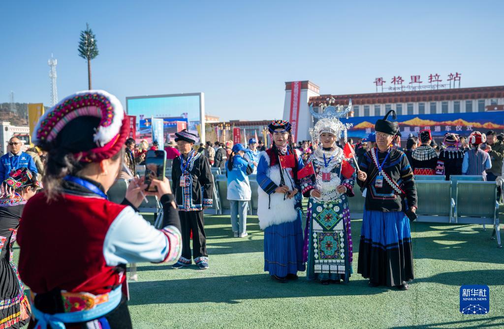 11月26日,参加丽香铁路开通仪式的少数民族代表用手机拍照留念。目前,中国移动已实现丽香铁路及沿线周边区域4/5G信号100%覆盖。