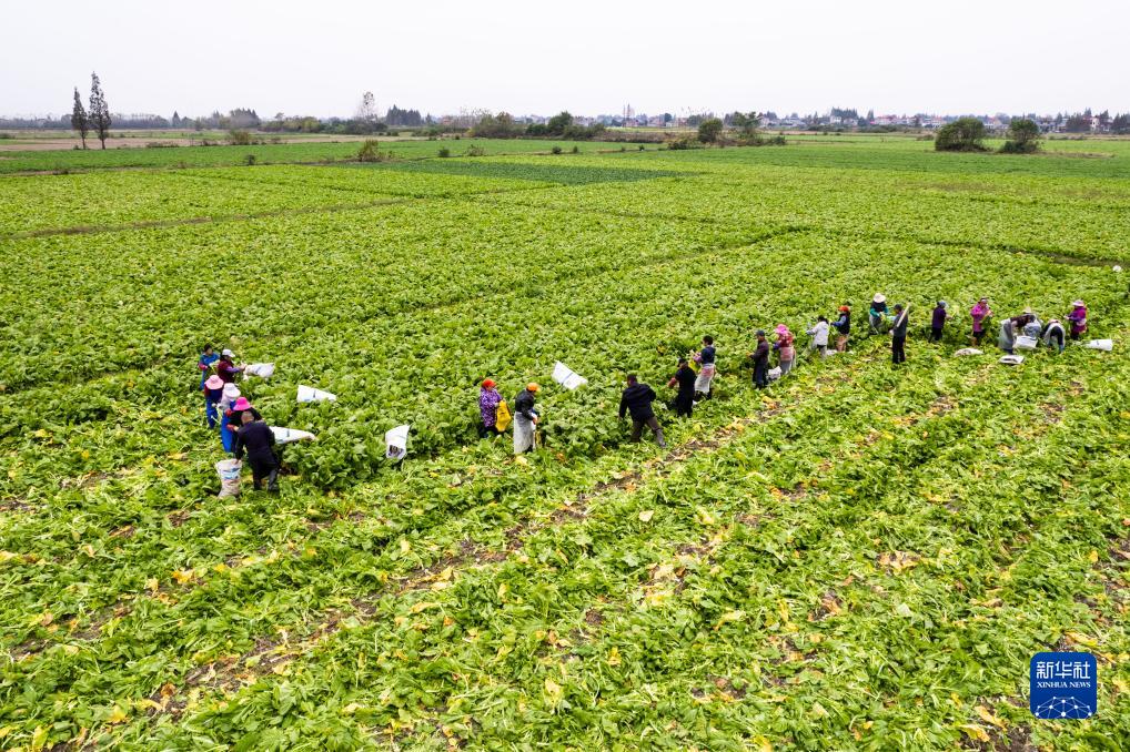 近日,湖南省益阳市南县种植的榨菜迎来丰收,村民们趁着晴好天气抓紧采收,削根、去叶、装袋,田间地头一派忙碌景象。今年南县榨菜种植面积约2万亩,总产值有望达到5000万元。