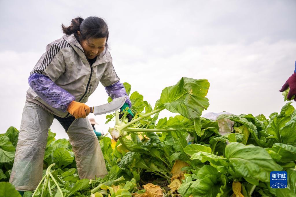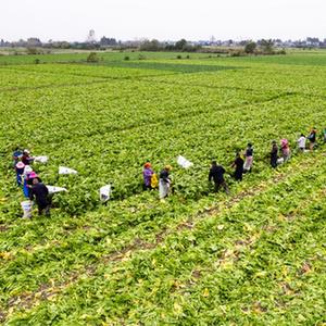 近日,湖南省益阳市南县种植的榨菜迎来丰收,村民们趁着晴好天气抓紧采收,削根、去叶、装袋,田间地头一派忙碌景象。今年南县榨菜种植面积约2万亩,总产值有望达到5000万元。