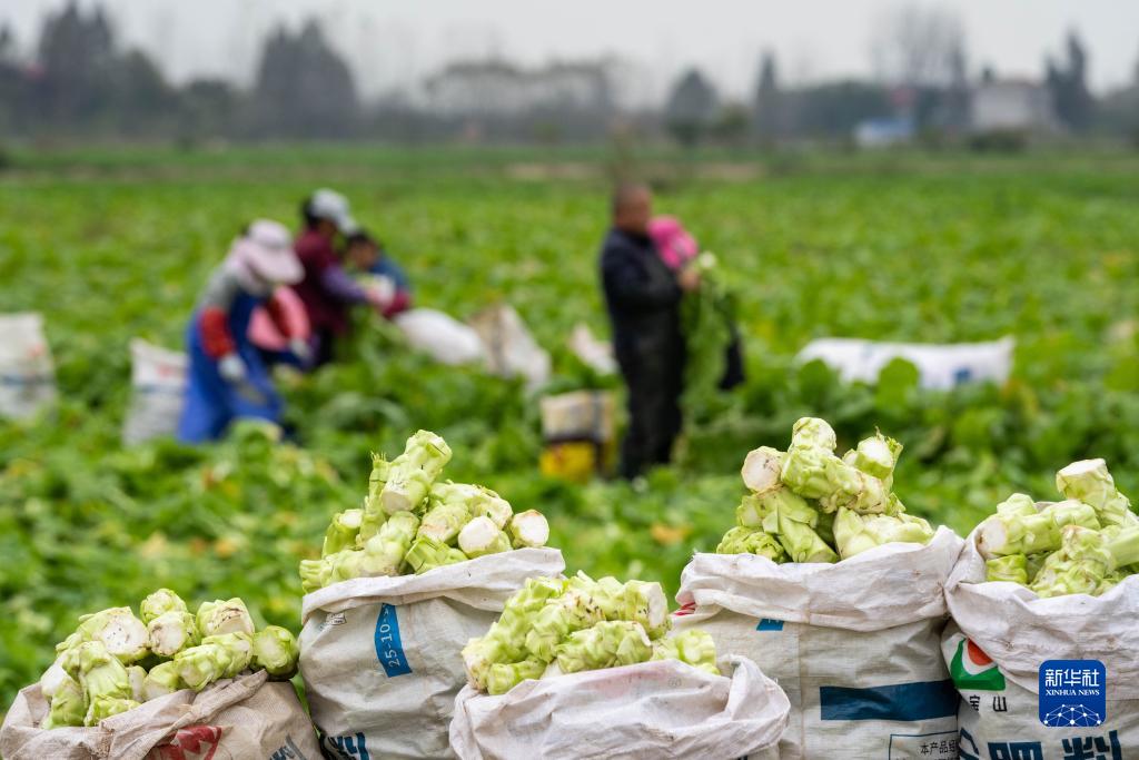 近日,湖南省益阳市南县种植的榨菜迎来丰收,村民们趁着晴好天气抓紧采收,削根、去叶、装袋,田间地头一派忙碌景象。今年南县榨菜种植面积约2万亩,总产值有望达到5000万元。