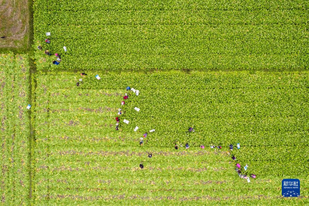 近日,湖南省益阳市南县种植的榨菜迎来丰收,村民们趁着晴好天气抓紧采收,削根、去叶、装袋,田间地头一派忙碌景象。今年南县榨菜种植面积约2万亩,总产值有望达到5000万元。