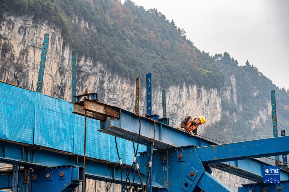 11月26日,在位于重庆市酉阳土家族苗族自治县龚滩镇的阿蓬江大桥施工建设现场,工人正在现场作业。