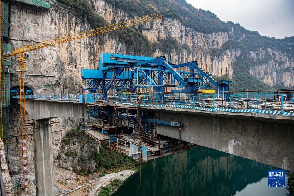 11月26日,在位于重庆市酉阳土家族苗族自治县龚滩镇的阿蓬江大桥施工建设现场,工人正在现场作业。