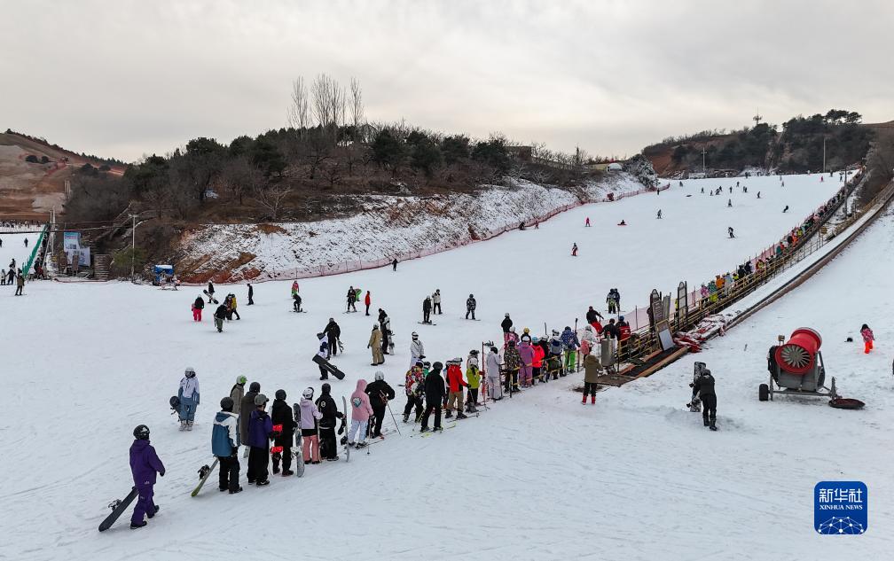 11月26日,滑雪爱好者在位于天津市蓟州区的蓟洲国际滑雪场内排队体验雪上运动(无人机照片)。