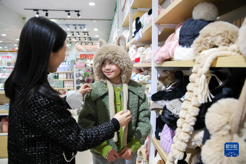 11月26日,在河南省洛阳市洛宁县一商场,顾客试戴帽子。