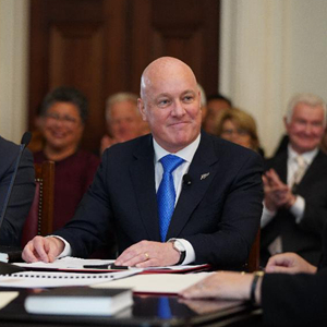 11月27日,在新西兰首都惠灵顿,国家党领导人克里斯托弗·拉克森(中)参加宣誓就职仪式。