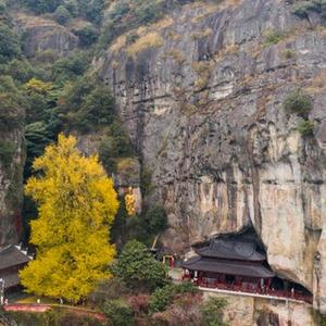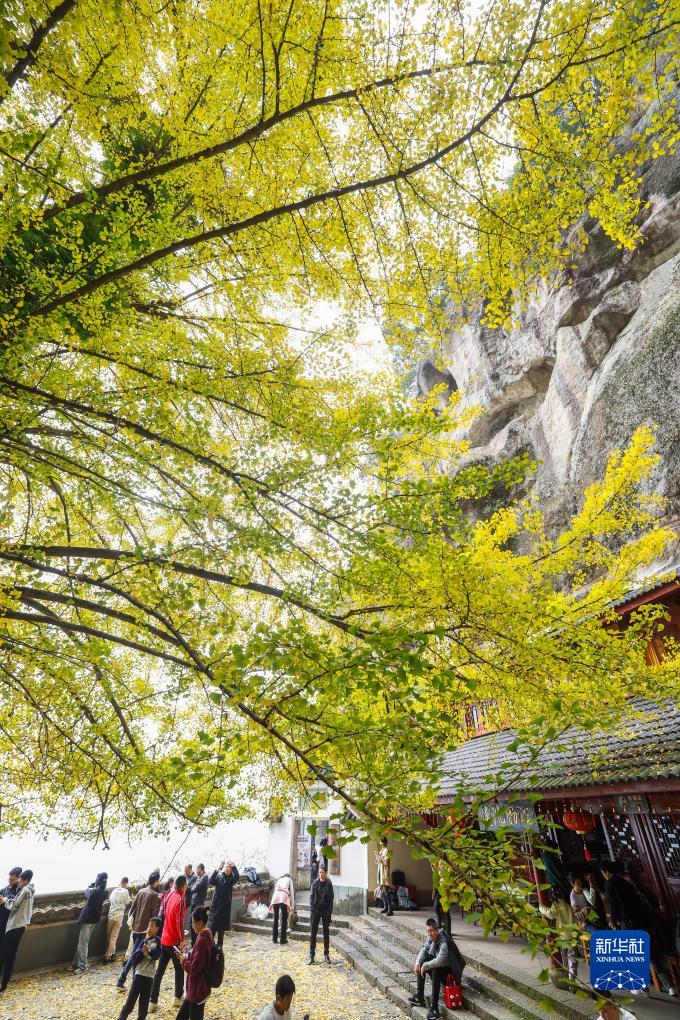 初冬时节,浙江省建德市大慈岩悬空寺前的古银杏树披上“黄金甲”,漫天飞舞的银杏“雨”,构成一幅绝美的图景,成为当地乡村旅游的网红打卡地。这棵古银杏树树高39.5米,胸径1.3米,曾入选“杭州十大最美古树名木”,树龄已有700多年,是建德的银杏之王。