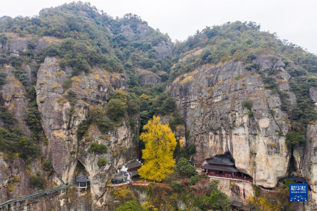 11月26日拍摄的悬崖旁的古银杏树(无人机照片)。