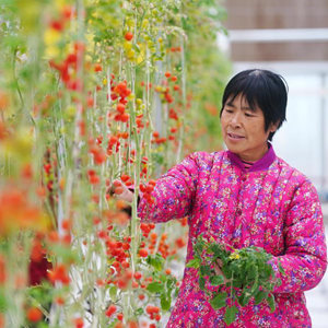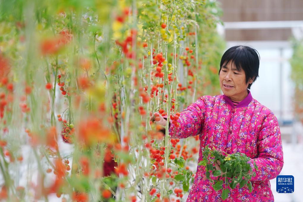 在平山县滹沱河高端设施蔬菜示范区育苗中心,大吾乡田兴村村民安凤翠管护小番茄(11月25日摄)。