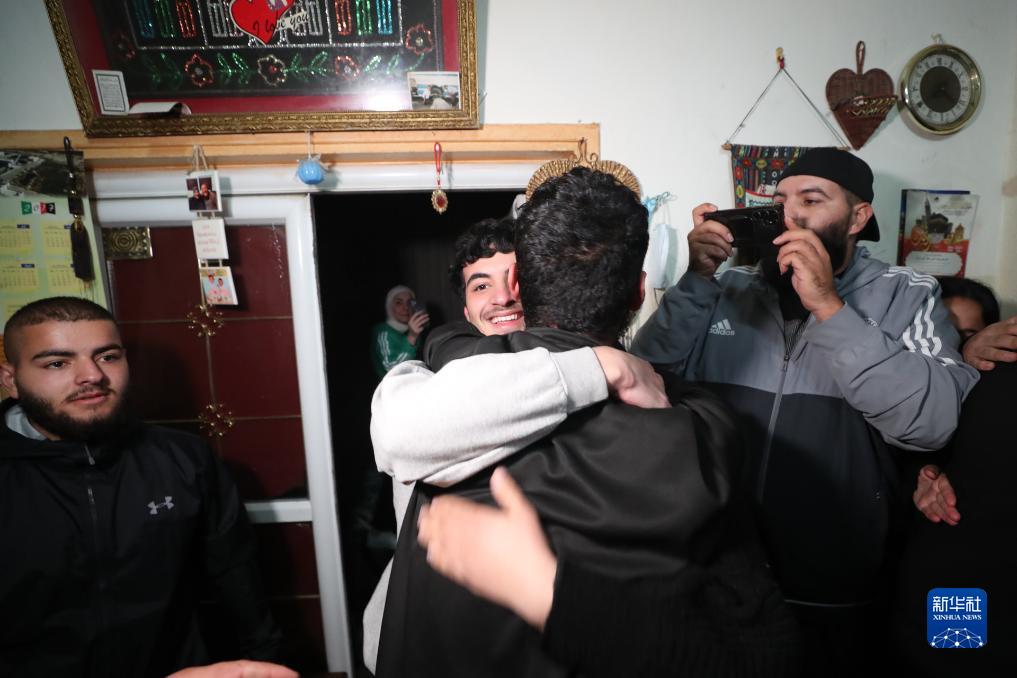 11月26日,一名被关押的巴勒斯坦人(灰衣者)获释后回到耶路撒冷。