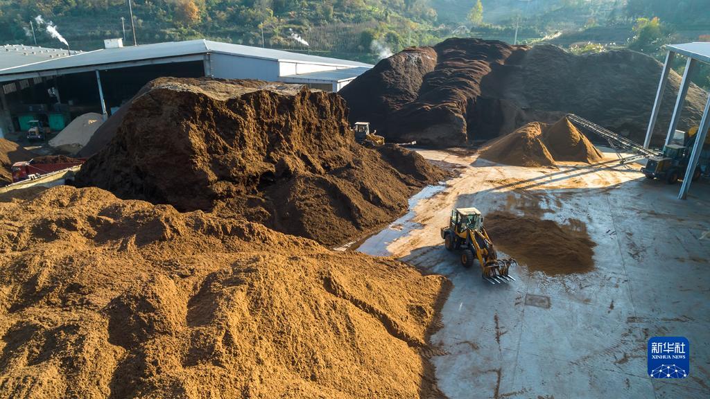 11月27日拍摄的道真仡佬族苗族自治县尹珍街道一处杏鲍菇种植基地的菌棒原料加工场(无人机照片)。