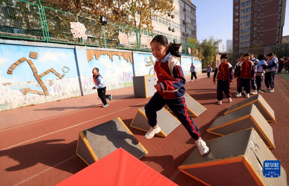 11月27日,河北省石家庄市仁华小学学生利用大课间进行“跨越坦克墩”游戏。