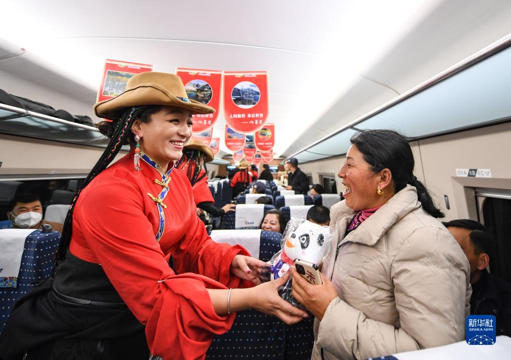 11月28日,在C6008次首发列车上,来自阿坝州民族歌舞团的演员给乘客赠送纪念品。